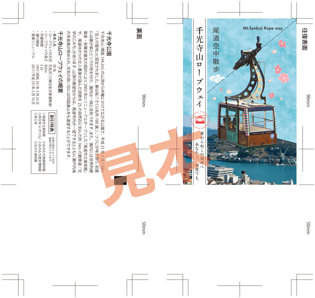 尾道にある千光寺山ロープウェイの展望台がリニューアルするのと同時に新しいデザインとなった乗車チケット。 日本遺産である尾道水道と新社屋となった尾道市役所をバックに桜の名所であることを併せてアピールしたデザイン。