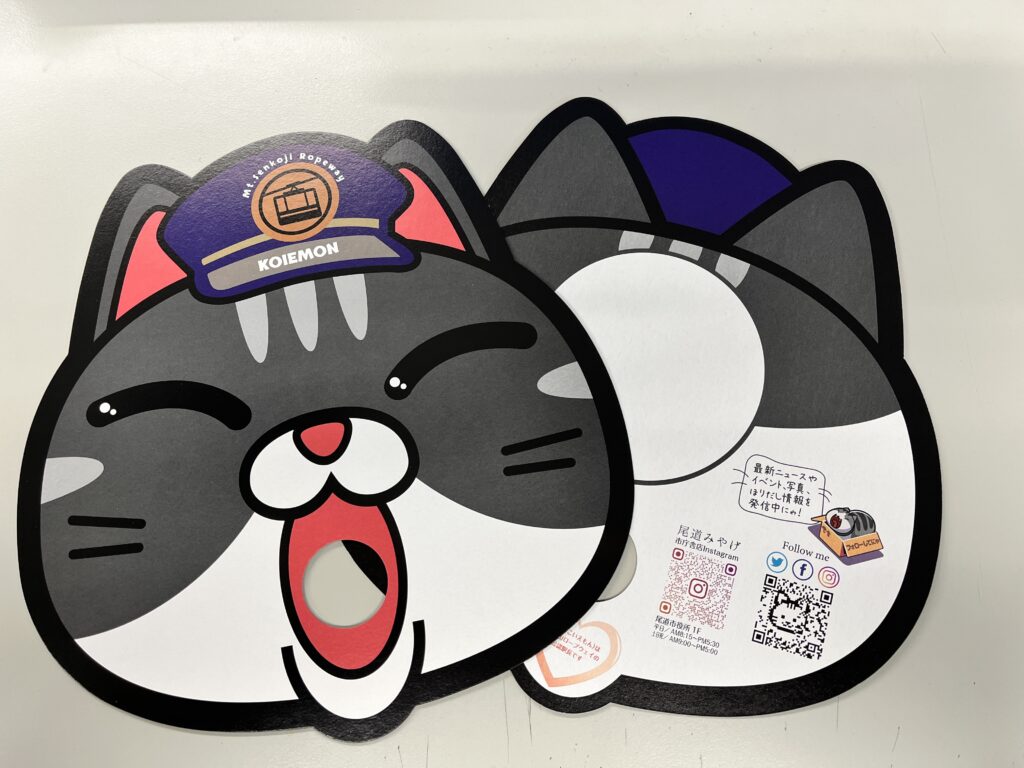 毎年恒例になった、夏季に配布する千光寺山ロープウェイのうちわをデザイン。 駅長の恋衛門を前面にデザインし、裏面にはショップリストやスタンプが押せるエリアを確保。夏季を通じて2万枚が配られている。